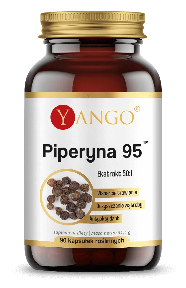 Yango, Piperyna 95 to suplement diety w formie kapsułek, opracowany dla osób dorosłych. Produkt w swoim składzie zawiera składniki, które wspierają procesy trawienne oraz mogą pozytywnie wpływać na kontrolę masy ciała.
