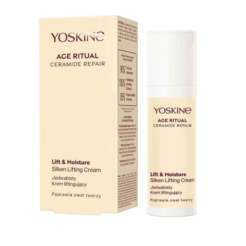 Yoskine Age Ritual to produkt kosmetyczny, jedwabisty krem liftingujący do twarzy. Formuła kremu ma na celu wygładzenie i ujędrnienie skóry, a także redukcję widoczności zmarszczek. Produkt zawiera składniki, które wspierają naturalne procesy regeneracyjne skóry oraz nawadniają ją. Krem przynosi ulgę napiętej skórze, zapewniając jej elastyczność i komfort. Zalecany do codziennego stosowania w celu poprawy kondycji skóry.Składniki/Ingredients