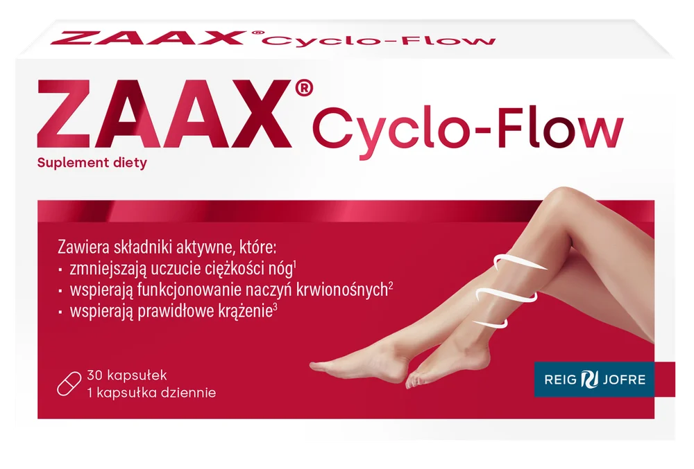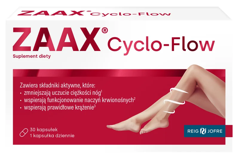 ZAAX Cyclo-Flow to suplement diety w kapsułkach, którego składniki wspierają prawidłowe krążenie żylne oraz pomagają utrzymać uczucie lekkości nóg. Formuła preparatu została opracowana tak, aby wspomagać naczynia krwionośne i sprzyjać komfortowi nóg w codziennym funkcjonowaniu. Produkt przeznaczony dla osób dorosłych.