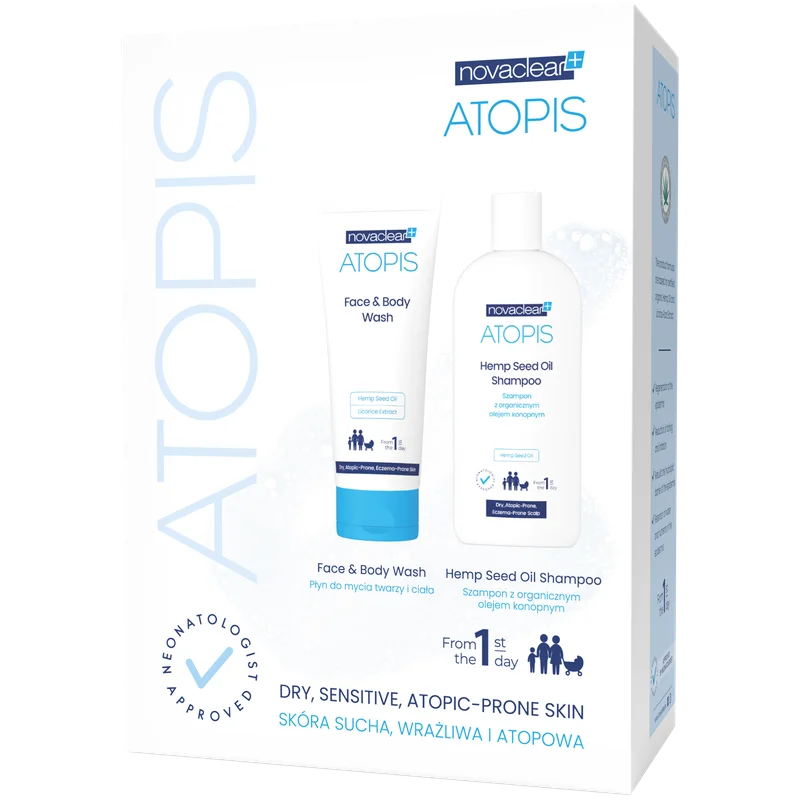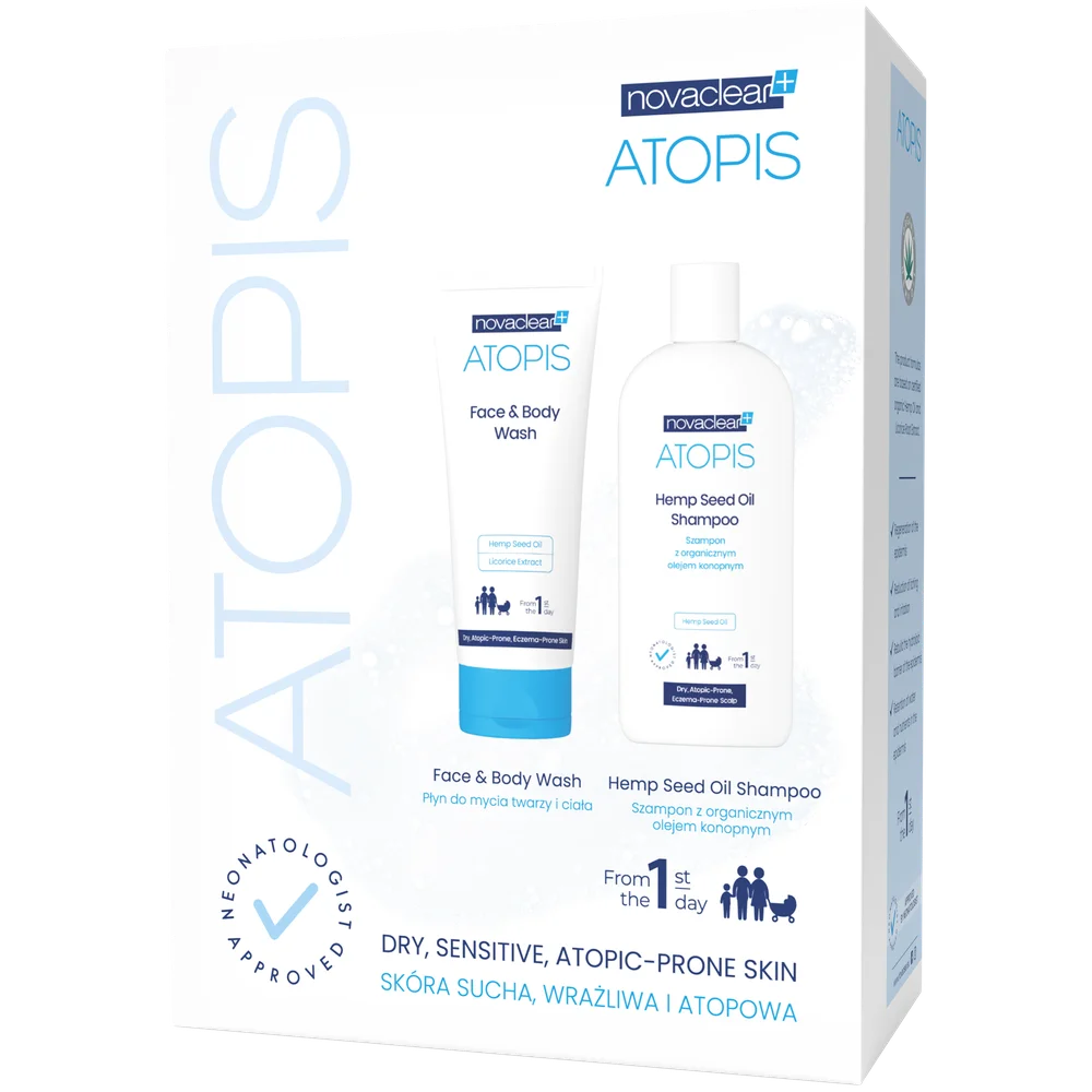Zestaw Novaclear Atopis, szampon z organicznym olejem konopnym, 250 ml, płyn do mycia twarzy i ciała, 200 ml
