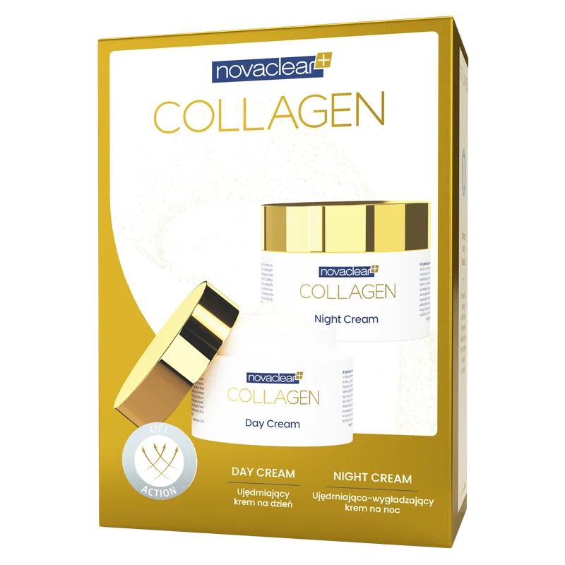 Novaclear Collagen to duet pielęgnacyjny składający się z kremu na dzień i kremu na noc, każdy w opakowaniu 50 ml. Krem stosowany w ciągu dnia dostarcza skórze nawilżenia i pomaga utrzymać jej zdrowy wygląd, natomiast krem nocny wspiera intensywną odbudowę, odżywia i poprawia sprężystość. Obie formuły wykorzystują składniki wspomagające naturalną produkcję kolagenu, co przekłada się na bardziej jędrną, gładką i promienną cerę.