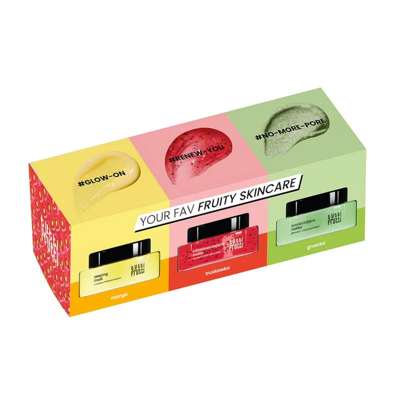 Zestaw Tutti Frutti Your fav skincare pielęgnacja twarzy, maseczki to produkt kosmetyczny, który zawiera trzy różne maseczki do twarzy, które pozwalają kompleksowo zadbać o skórę – nawilżyć, oczyścić i wygładzić – tworząc rytuał, który zamienia pielęgnację w przyjemność.